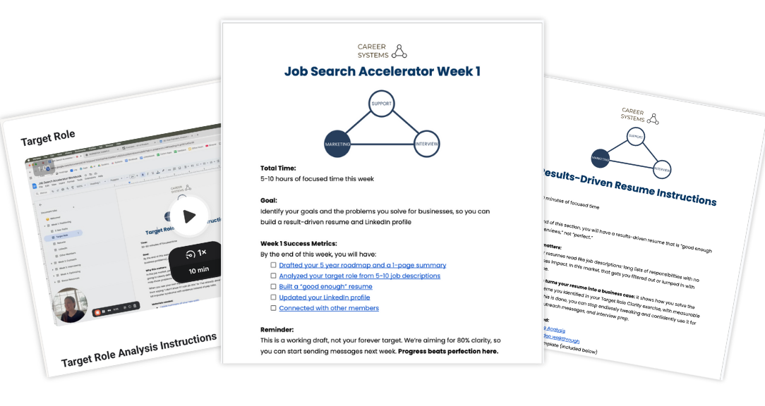 Week 1 is the first step of a 4‑week system that covers the end‑to‑end job search with step-by-step instructions, templates, and checklists.